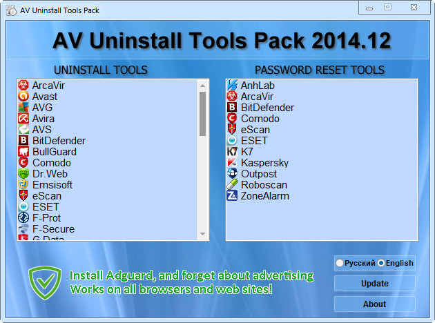 AV Uninstall Tools Pack- es un paquete gratuito de herramientas diseñadas para eliminar antivirus y software de seguridad. Incluye herramientas para la eliminación de más de 40 programas antivirus y cortafuegos y antispyware - cortafuegos. Si usted necesita para eliminar completamente el virus, por lo que no deja rastros en el sistema, utilice el Utilidades de paquetes de AV Herramientas NINSTALL paquete. Utilidades para eliminar...
